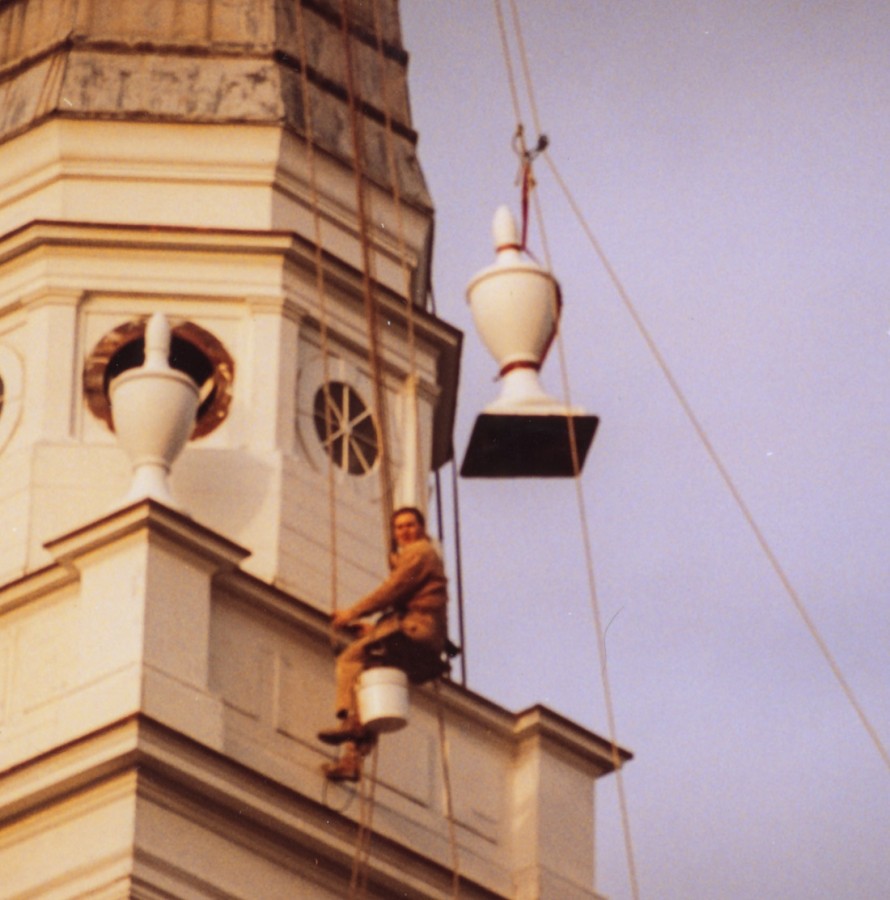 27292, North CarolinaRepair copper flashing at base of church steeple, from bosn's chair. Structural steel install stabilize, slate repair, restored ladder access to belfry, installed bird barrier belfry openings.