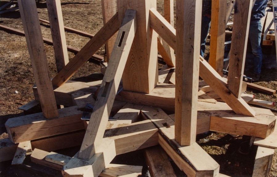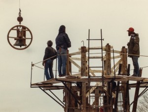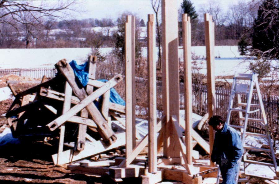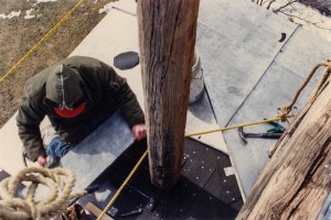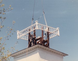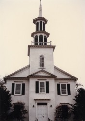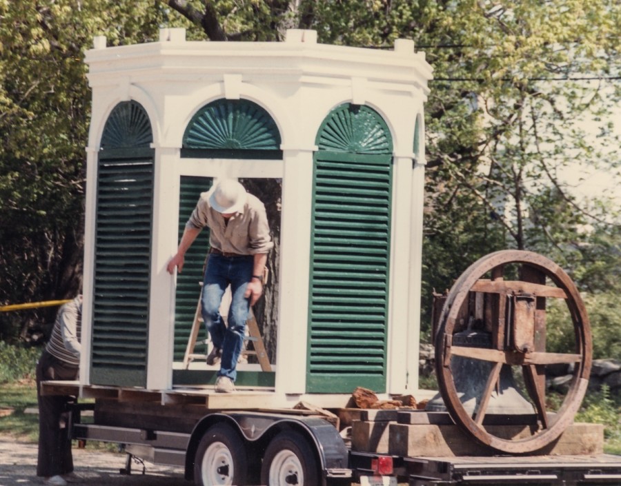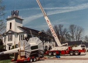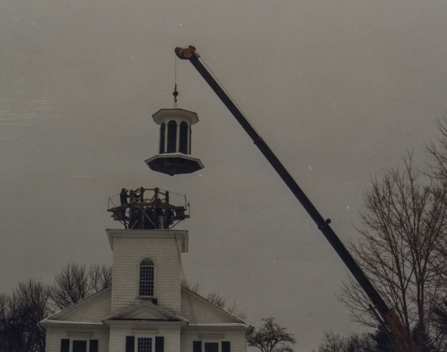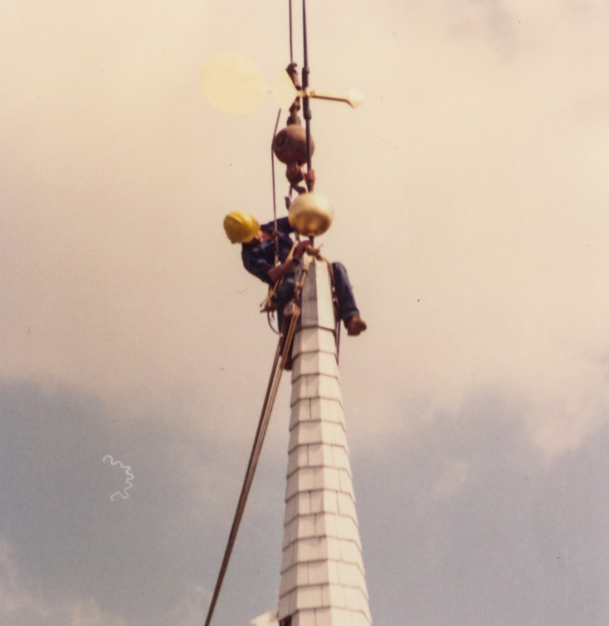 06883, ConnecticutFabrication and replacement of upper steeple and spire, timber frame, belfry exterior, balustrade and restoration of bell, replacement of belfry deck with flat seamed leaded copper. Large elements removed and installed with assistance of crane. Reshaped main timber frame roof trusses with crane, returning steeple to plumb. Designed and fabricated reproduction weathervane from century old hand drawing, gilded and installed.