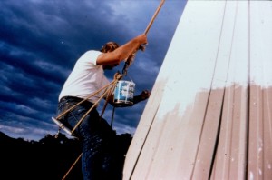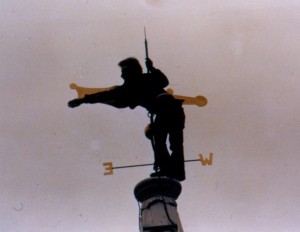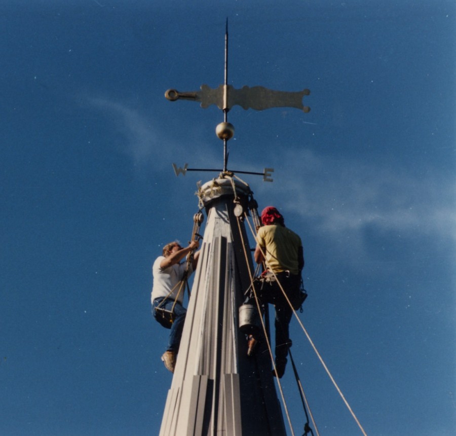 Steeplejacks in bos'n's chair painting steeple, gilding of weathervane and cardinal points.