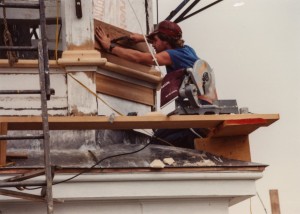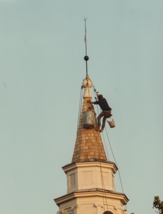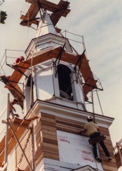 02818, Rhode IslandOn wood steeple, extensive replacement of exterior woodwork, replacement of all leaded copper flashing and roofs. Replacement of belfry deck with leaded copper, redesign bell deck to improve wash, redesign church bell suspension to improve stability. Restoration and gilding weathervane with 23 carat gold leaf.