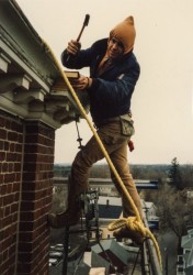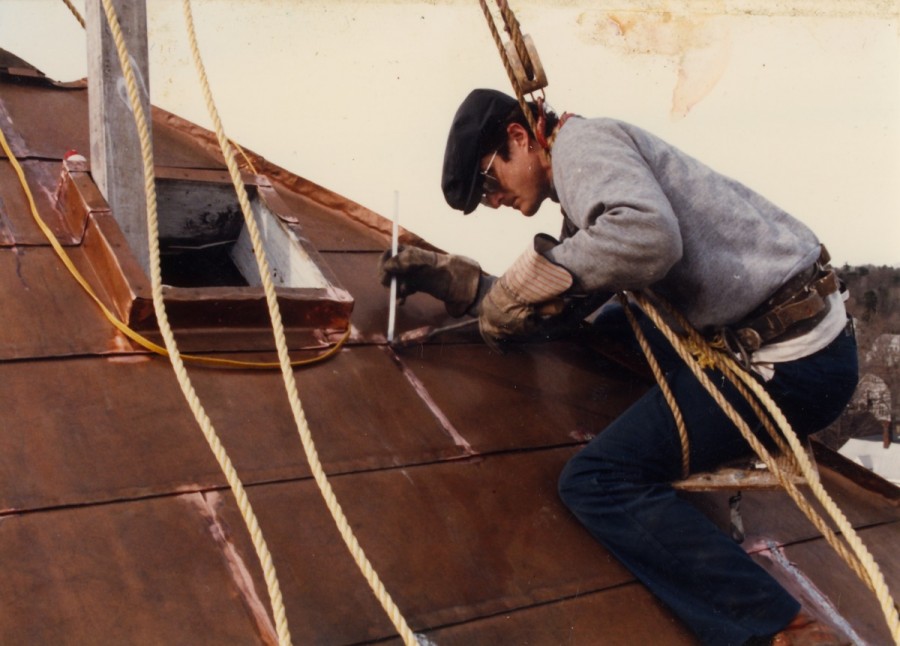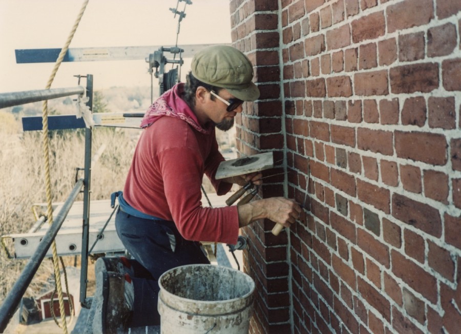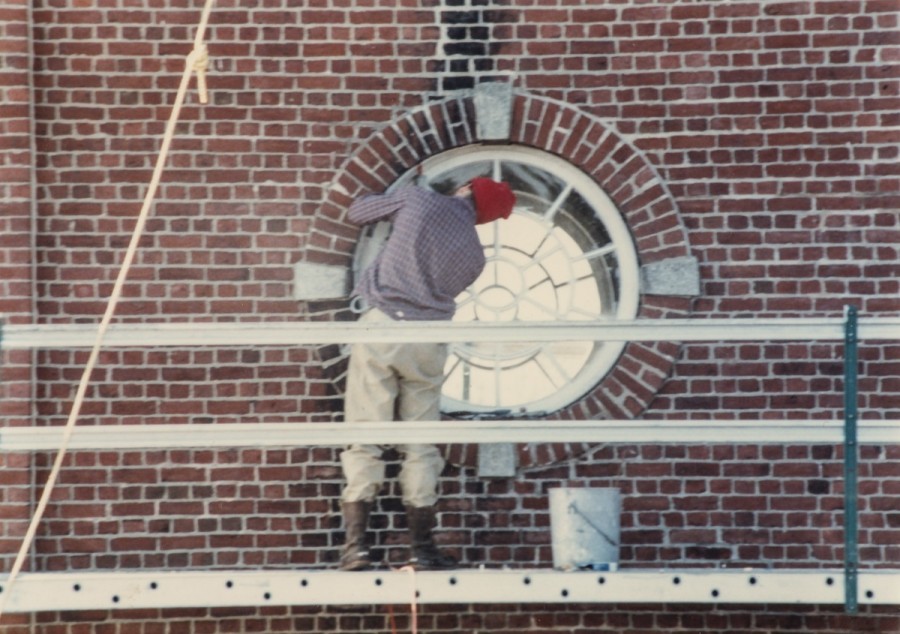 Masonry Restoration. Tuck pointing brick bell tower, new copper roofs, new round wood window sash.